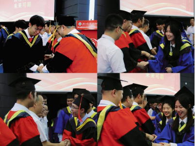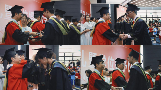 拨穗正冠、毕业礼成。2024届毕业生有序登台,赵志伟、郭永昌、吴希文、姜海波、冯为民、梁仕华、杨晚生7位授位教授与毕业生逐一亲切握手、正冠拨穗、颁授学位证书并合影留念。浓浓深情溢于言表,共同铭记学生生涯的高光时刻。