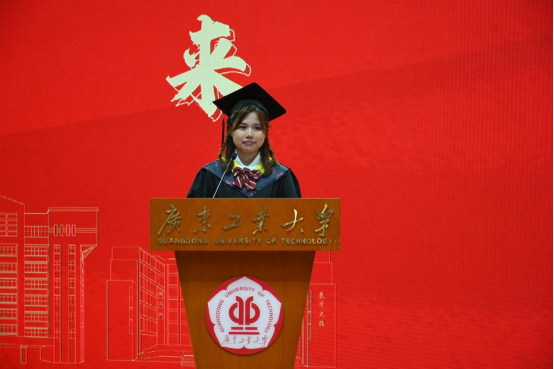 2019级工程管理1班陈少玲作为毕业生代表发言,表达了对母校、老师、父母以及同窗的感恩之情,与全体毕业生共勉:在崭新的人生道路上,不畏风雨、踔厉奋发、笃行不怠、在各自岗位为国建功立业,书写灿烂人生。