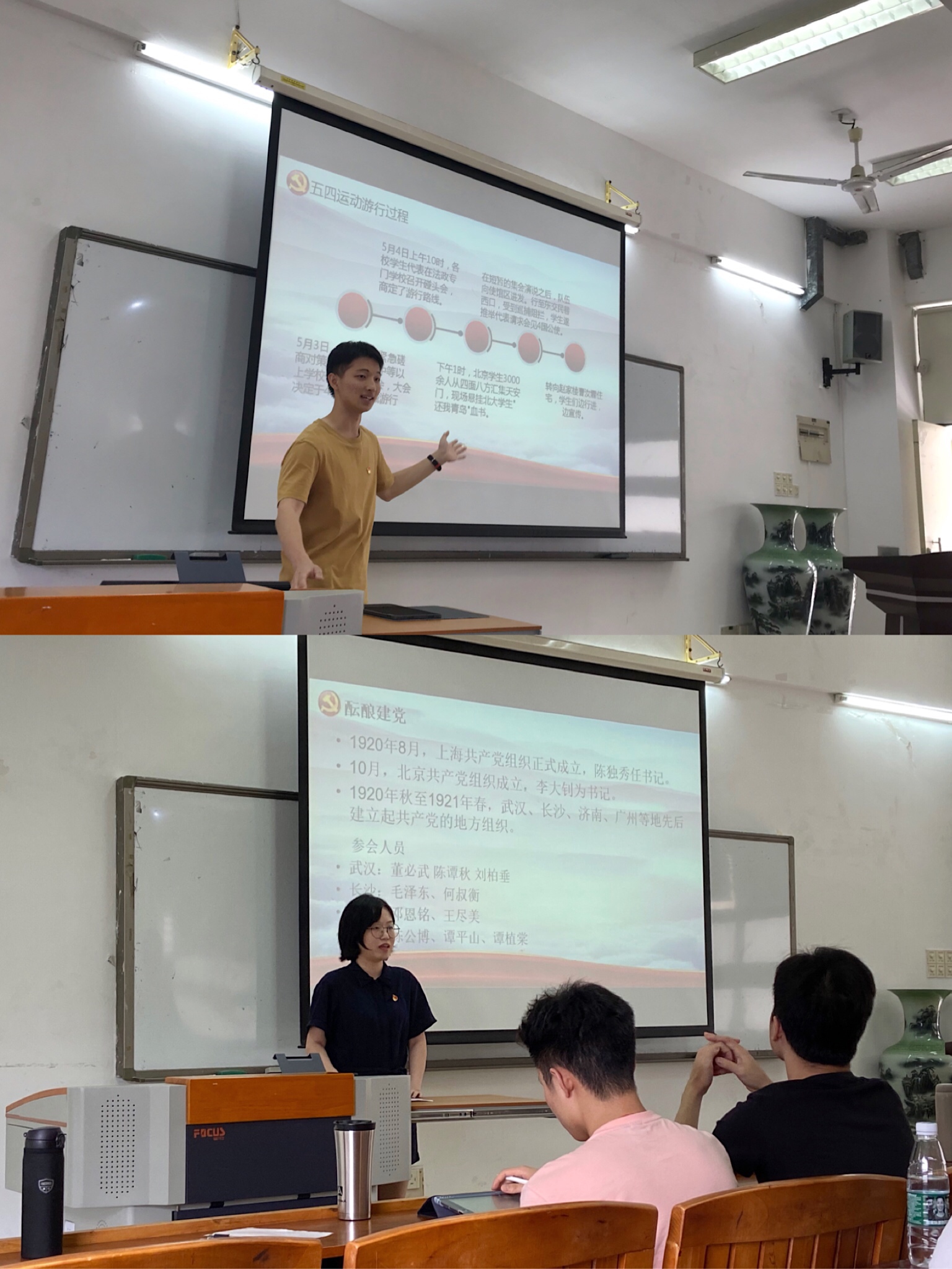 第一组的陈泽豪和黄嘉敏同志,以“建党”为主题,简述“五四运动”到中共二大的历史。两位同志结合影像资料,讲述了“五四运动”唤醒腐朽人心、唤醒国民一腔热血的历史。接着,两位同志又通过讲述“中共一大”、“中共二大”两个重要会议的纲领与意义,向大家展示了一段过程曲折又意义重大的恢宏党史。