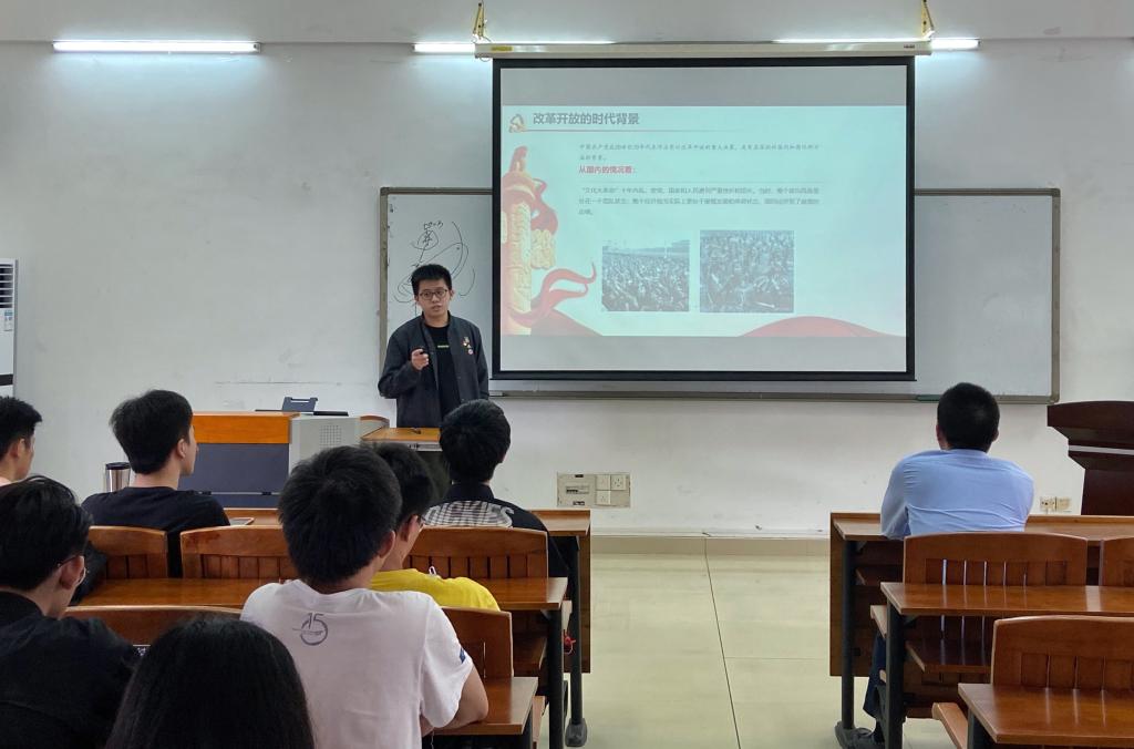 第四组的何昭贤同志,以“改革开放”为主题,介绍了关于改革开放的背景、成就和经验。首先,他向大家简要介绍“为什么要进行改革开放”。接着,他结合影视资料,直观地向大家展示了改革开放的主要成就。最后,通过四个“坚持”向大家介绍在改革开放时期的宝贵经验。