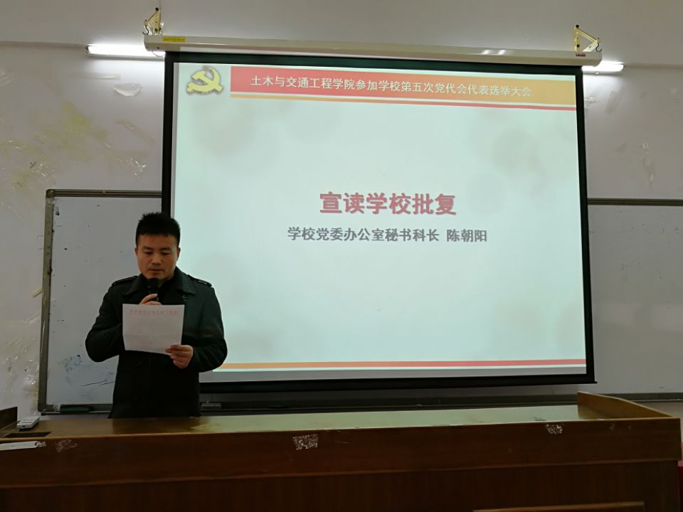 会议在雄壮的《国歌》声中开始,学校党委办公室秘书科科长陈朝阳宣读学校批复。随后,大会通过了总监票人、监票人、计票人名单,大会工作人员向与会党员逐一介绍了代表候选人预备人选的名单及各人基本情况。